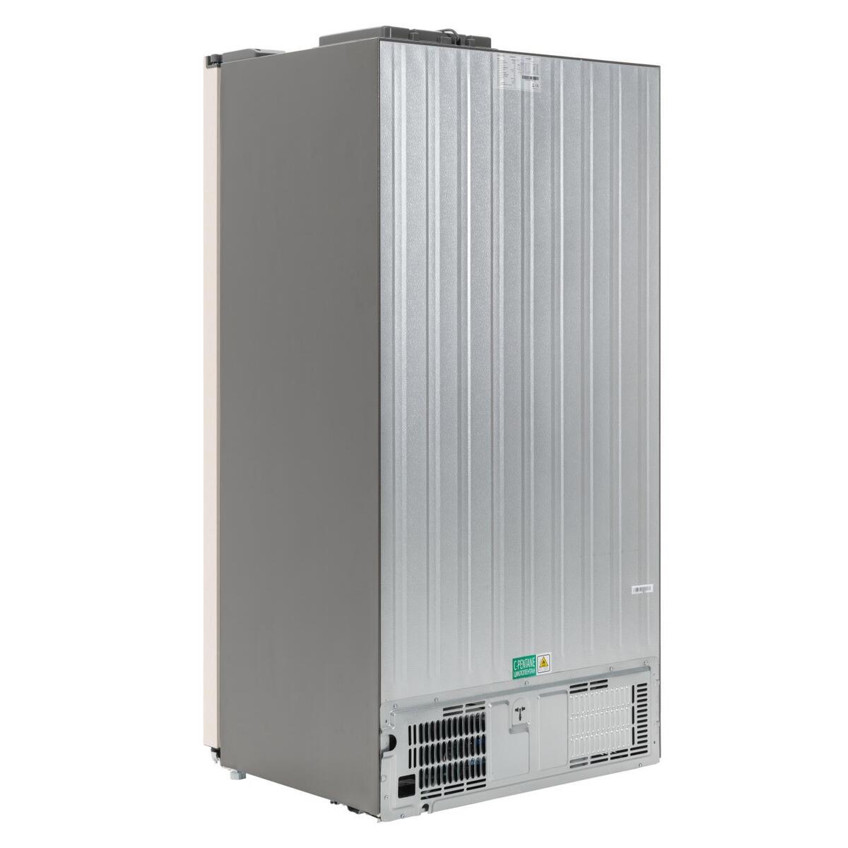 Модель side by side создана для тех, кто ценит удобство и функциональность. Он двухдверный, что обеспечивает легкий доступ к содержимому. В холодильнике предусмотрены отдельные камеры для хранения различных продуктов. Двухкамерная конструкция позволяет удобно разделять зоны охлаждения и замораживания. В холодильнике есть морозилка с системой ноу фрост, что избавляет от необходимости ручной разморозки. Она предотвращает образование льда и инея на продуктах и стенках камер. Холодильное отделение оснащено 4 стеклянными полками, которые облегчают процесс уборки и позволяют видеть содержимое ящиков и контейнеров. Бытовая техника представлена в бежевом мраморном цвете, добавляя элегантности любому интерьеру кухни.