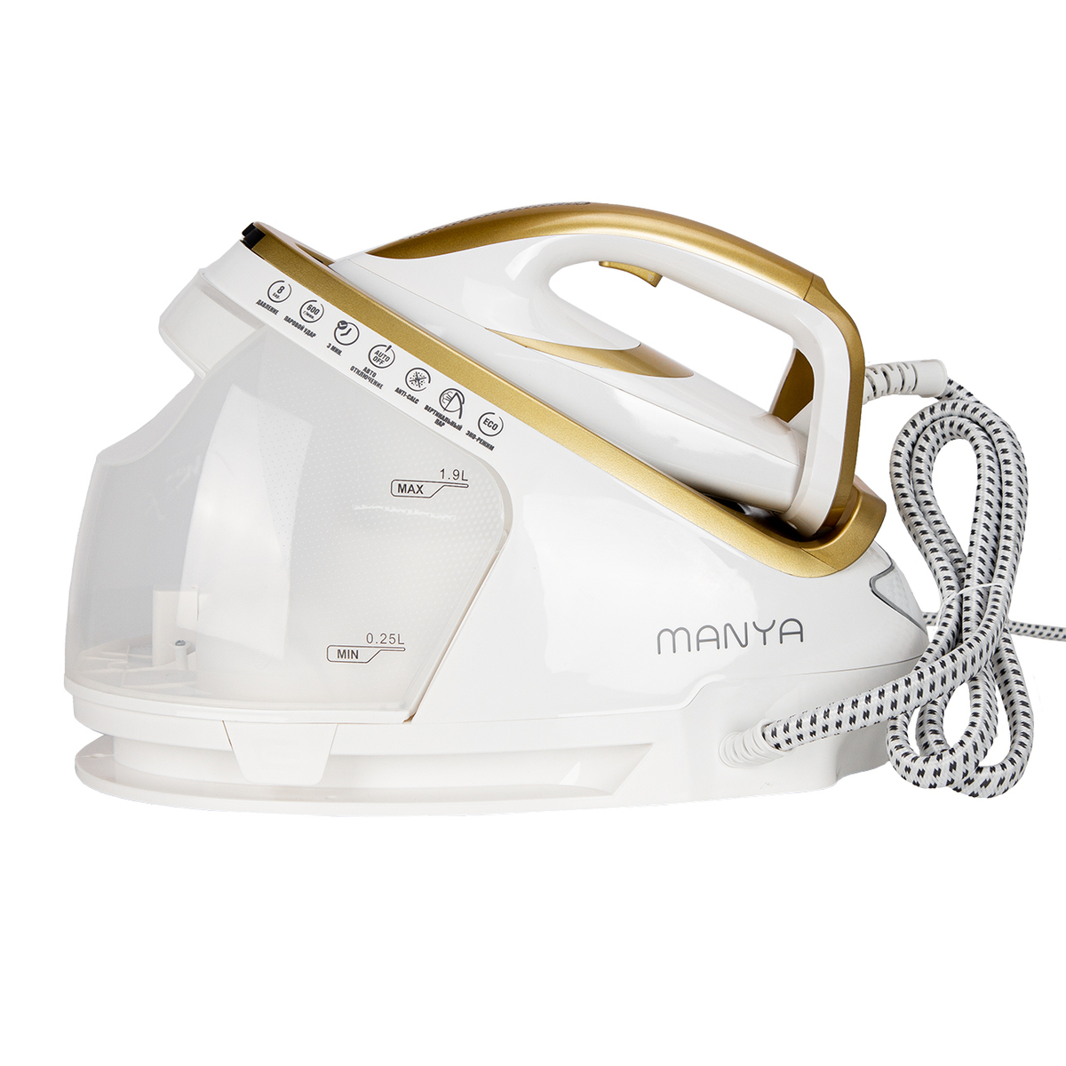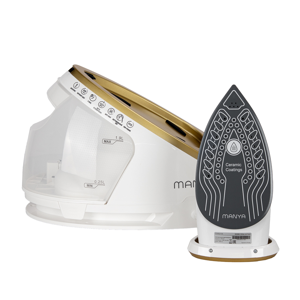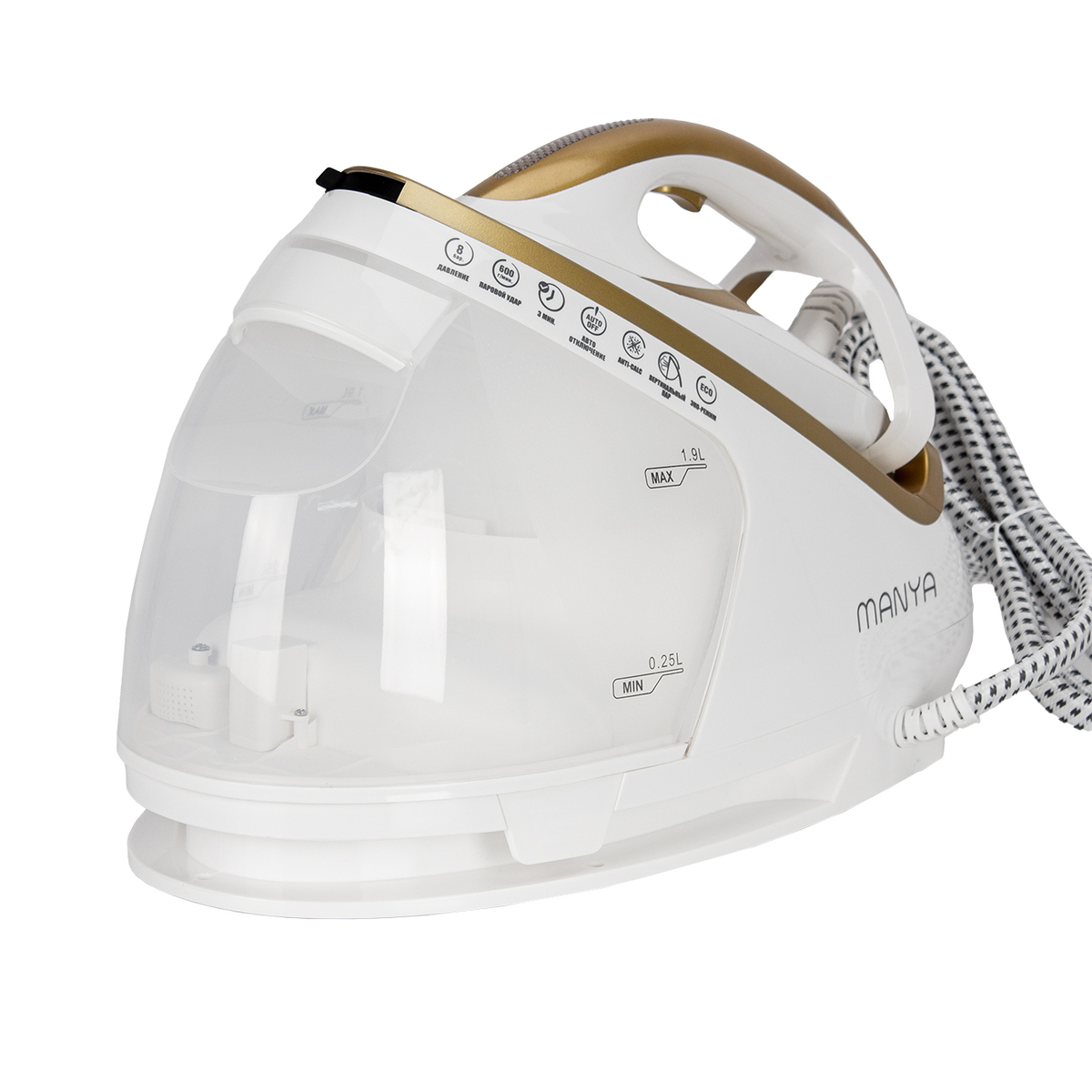 Мощность 3000Вт. Паровой удар 600 г/мин, Постоянная подача пара 140 г/мин, Объем емкости для воды: 1,9л. Давление пара 8 бар, Длина шнура 1,8,м. Подошва - керамика. Время разогрева 180 сек. ECO режим, Съемный бак для воды, Функция вертикального отпаривания, Предупреждение о нехватке воды, Система хранения для провода питания, Система фиксации утюга, Функция авто отключения, Функция анти-накипь, Функция сухой глажки, Сверхпрочная гладкая подошва из - керамики, 2 режима выбора оптимальной температуры для всех типов ткани, Технология оптимизации температуры подошвы утюга Размер подошвы (мм): 227*121. Длина шланга для подачи пара (м): 1,8. Основной цвет Белый/Золотой
