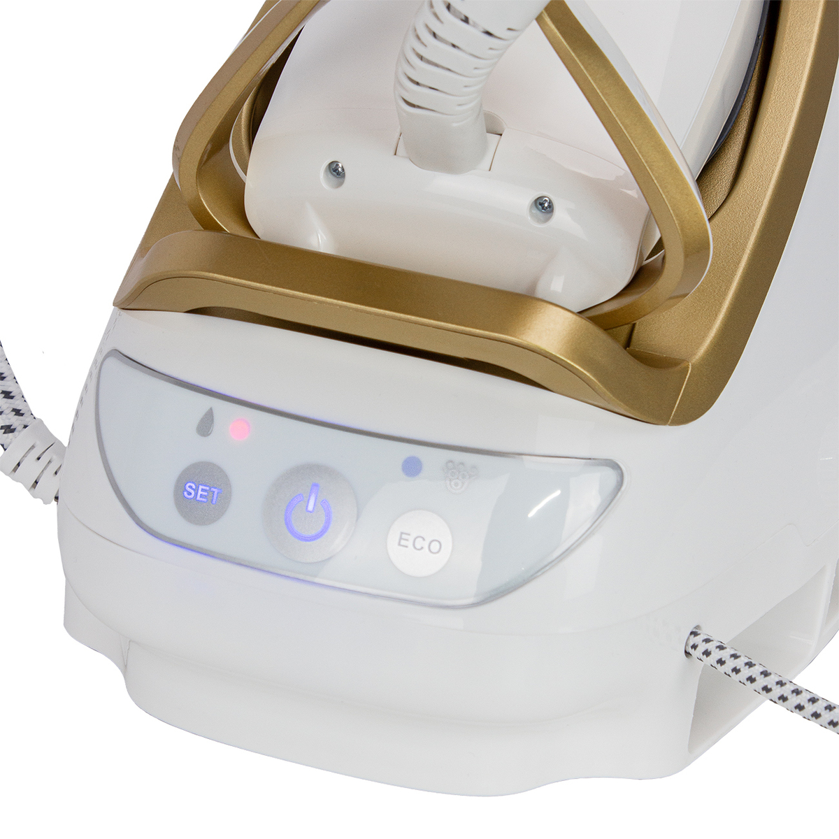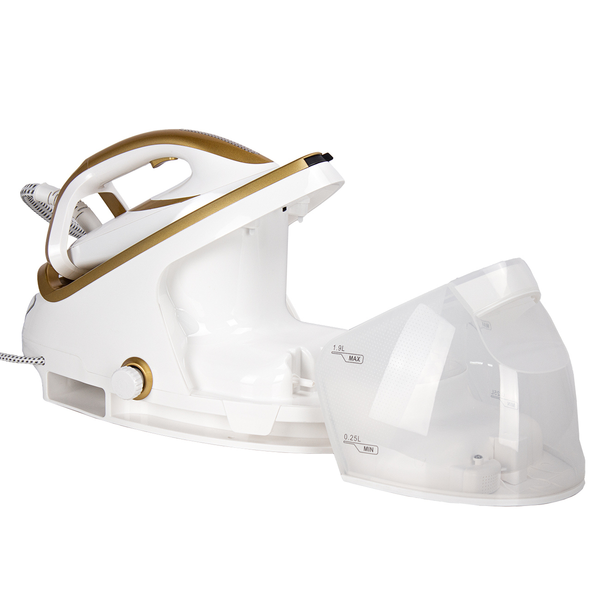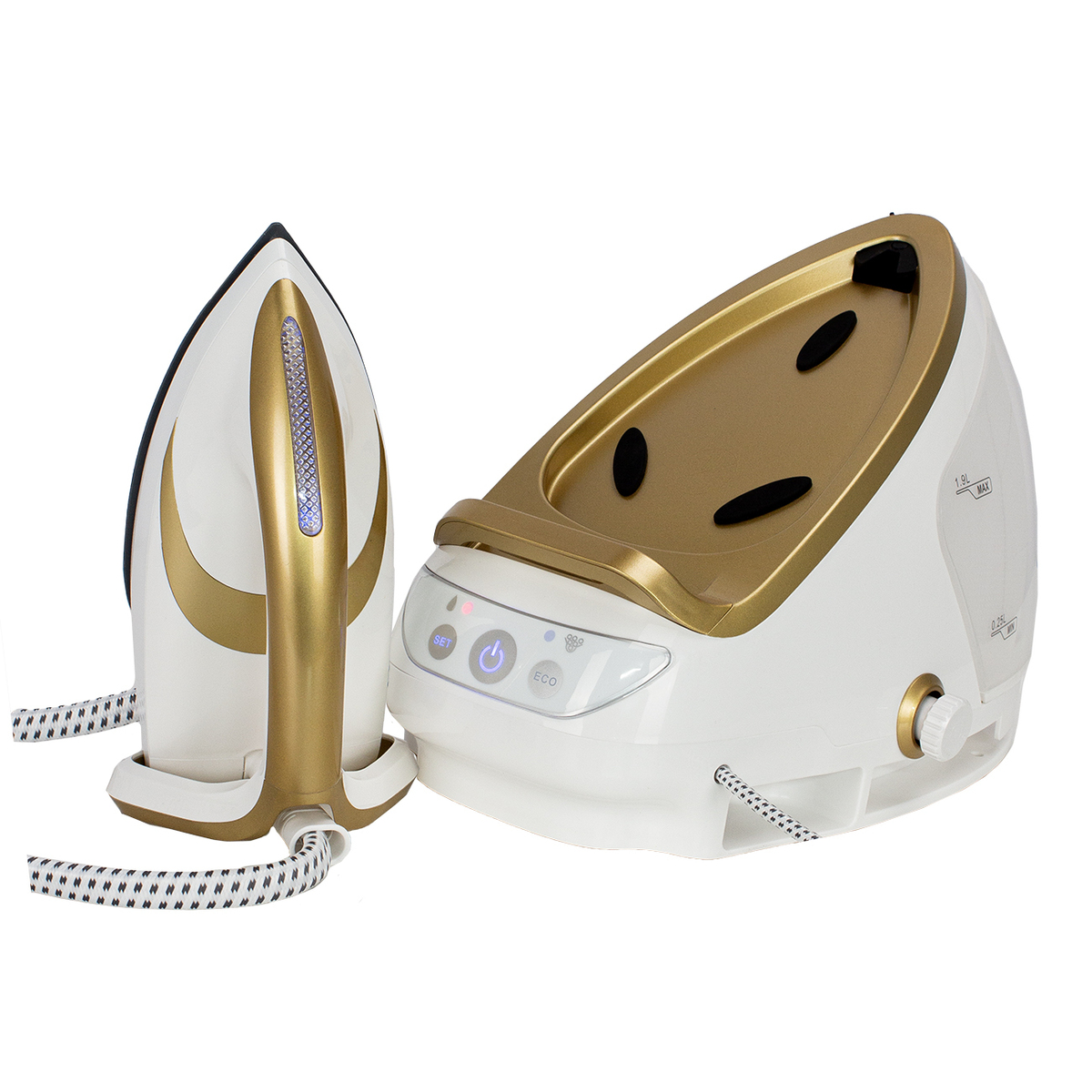 Мощность 3000Вт. Паровой удар 600 г/мин, Постоянная подача пара 140 г/мин, Объем емкости для воды: 1,9л. Давление пара 8 бар, Длина шнура 1,8,м. Подошва - керамика. Время разогрева 180 сек. ECO режим, Съемный бак для воды, Функция вертикального отпаривания, Предупреждение о нехватке воды, Система хранения для провода питания, Система фиксации утюга, Функция авто отключения, Функция анти-накипь, Функция сухой глажки, Сверхпрочная гладкая подошва из - керамики, 2 режима выбора оптимальной температуры для всех типов ткани, Технология оптимизации температуры подошвы утюга Размер подошвы (мм): 227*121. Длина шланга для подачи пара (м): 1,8. Основной цвет Белый/Золотой